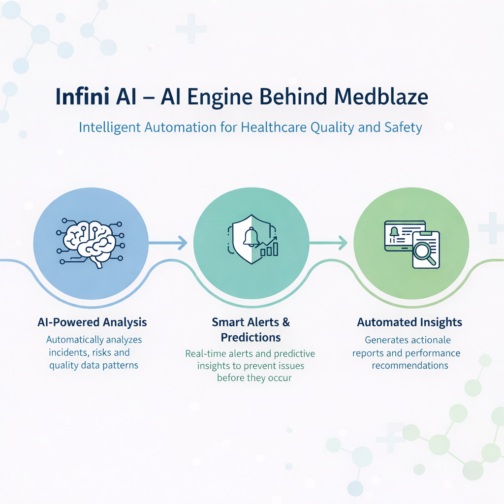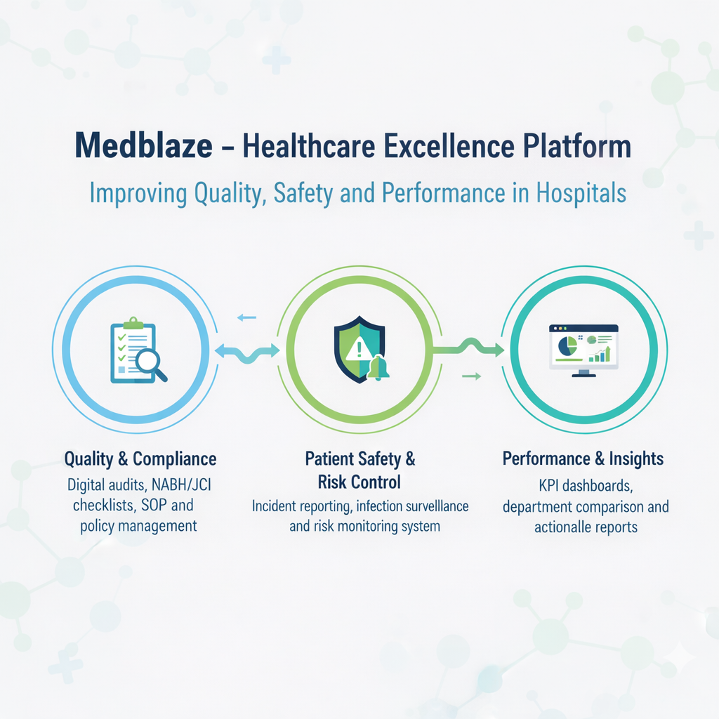 Medblaze offers a unified Healthcare Excellence Platform that supports quality management, accreditation, compliance tracking, patient safety, and AI-powered insights for hospital leaders.